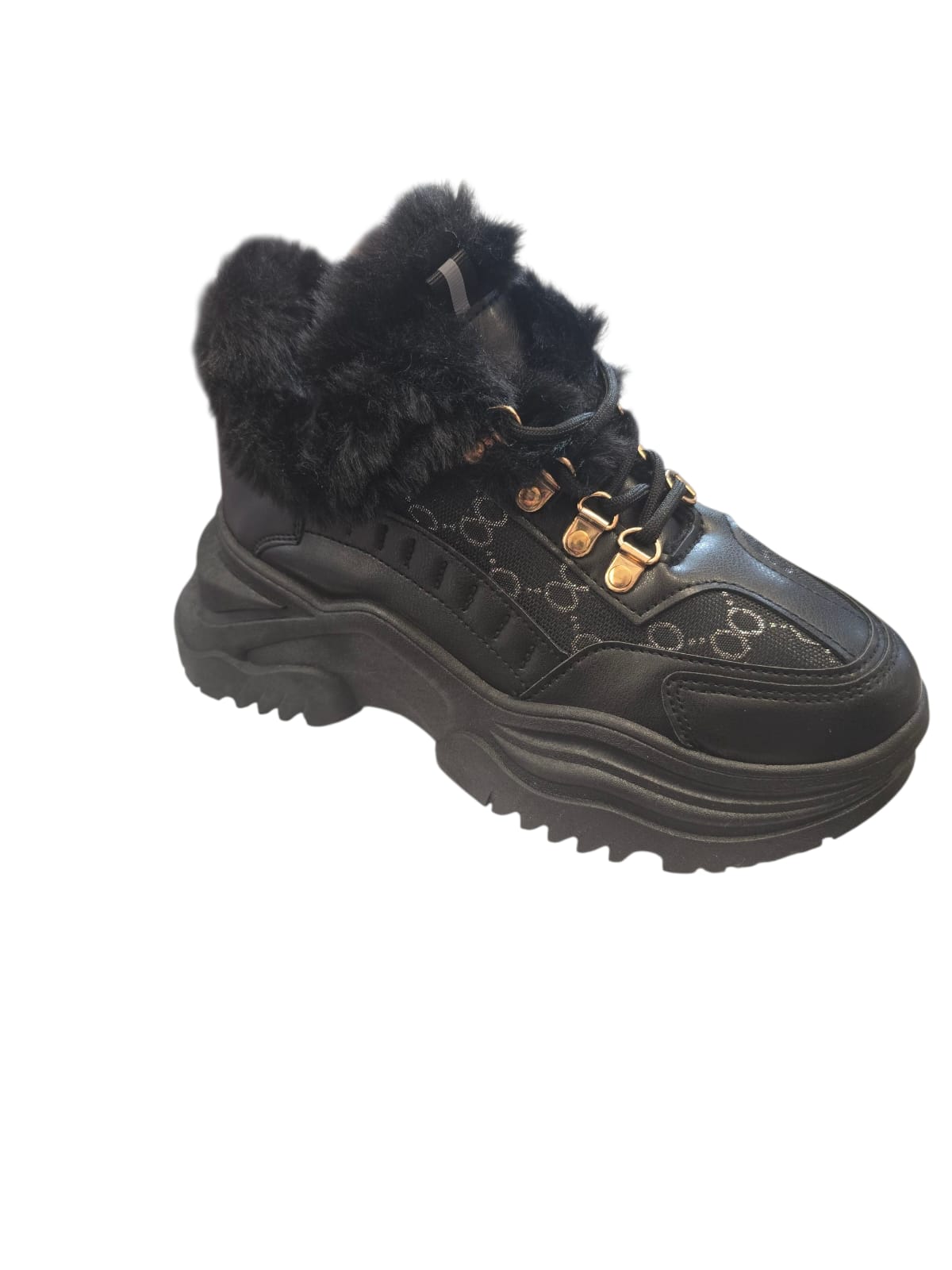 A sneaker–boot hybrid that brings winter warmth to street style. This pair pairs a plush faux-fur collar with a chunky, sculpted sole and gold-tone hardware for a luxe finish. The mixed-media upper features subtle monogram stitching and protective overlays, while deep-lug outsoles give confident grip on cold, wet days.