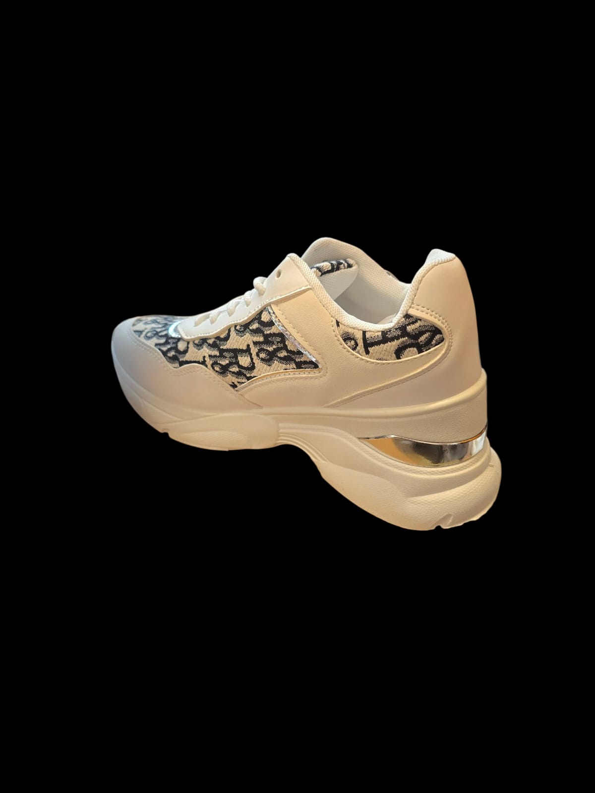 A sleek, fashion-forward trainer with statement details. Smooth cream uppers are paired with jacquard monogram panels and a polished metallic heel insert for a subtle flash. The sculpted sole keeps things light and comfy from coffee runs to city strolls.